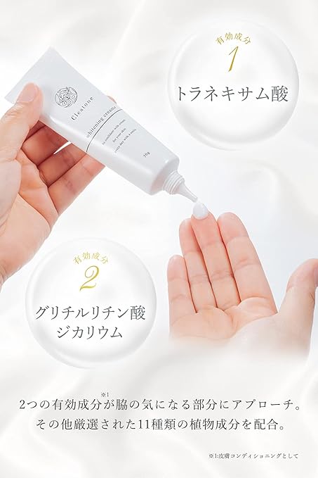 【脇の下のケアに】 制汗剤で荒れて掻きむしってしまう方にオススメです。半袖やノースリーブのトップスを着るときに、脇の黒ずみ※がとても気になります。ムダ毛処理の際、わきの下が気になる。脇の下の黒ずみ※ケアにぜひご利用ください。 お風呂に入っている時に鏡を見ると、バストトップや脇の下、ひざが気になります。 Tシャツやキャミソールになった時に、脇の下やひじ部分の黒ずみ※が目立つので気になる。 ムダ毛処理の際、わきの下が気になる。 ノースリーブを着た時に電車などつり革を持つのに脇を上げる機会があって黒ずみ※を気にしてしまう。