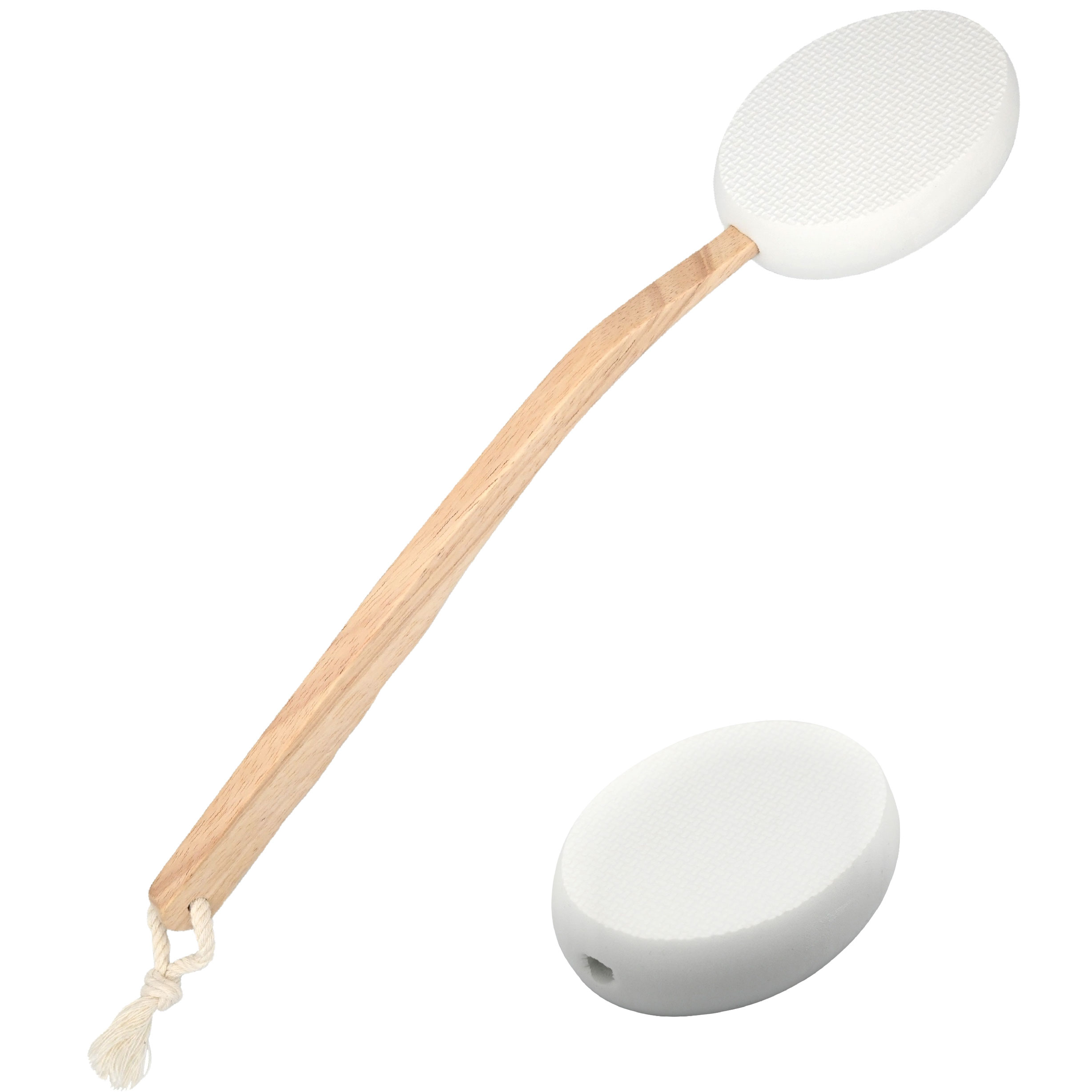 〇快適な使用感と機能性を両立するため、パッドには厚さ3cmの極厚EVA樹脂素材を採用し、摩擦を軽減。 クリームが垂れにくいエンボス加工が施されています。 柄はあたたかみのある木製で、握りやすい波型グリップ(人間工学デザイン)を採用し、衛生面を考慮してゴムグリップを排除しています。 サイズは、パッド込み全長44cmです。